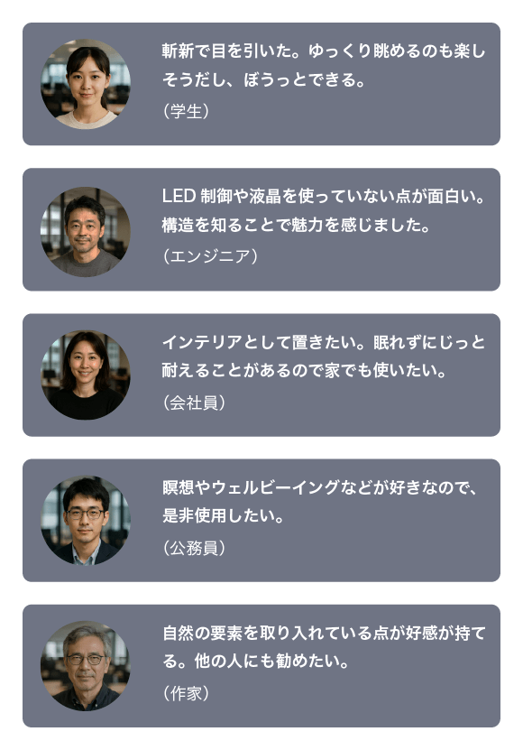 心地よさを感じる自然界のリズムのひとつ。一定でも不規則でもない、絶妙な“ゆらぎ”が、自律神経を整え、脳波にも良い影響を与えるとされる。TECRONICAでは液体の物理的な動き+屈折を用いて、光の揺らぎを自然な1/fに近づける試験・検証を行っています。